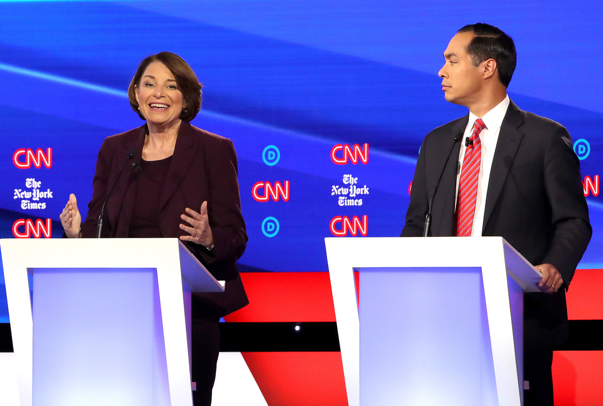 Minnesota Sen. Amy Klobuchar speaks as former Secretary of Housing and Urban Development Julián Castro looks on during the debate. Win McNamee/Getty Images hide caption