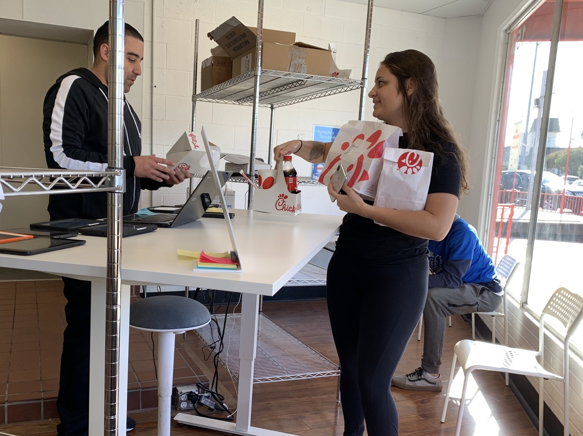 A driver picks up a Chick-fil-A order at the DoorDash kitchen in Redwood City, Calif. DoorDash's tenants include national chains as well as Bay Area brands. Shannon Bond/NPR hide caption