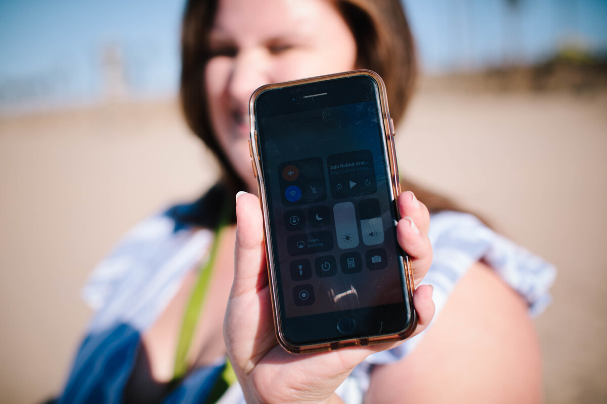 Chloe Schofield often works 12-hour-days during the workweek and has trouble unplugging on weekends. NPR's Sam Sanders gave her tips on how to really relax on her days off. One of those tips included putting her phone in airplane mode while at Huntington Dog Beach in Huntington Beach, Calif. Morgan Walker for NPR hide caption
