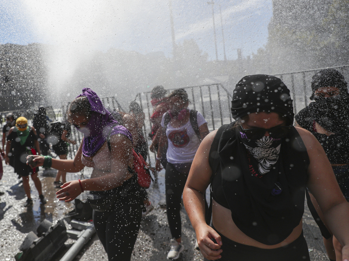 Women are sprayed by a police water cannon during clashes near La Moneda presidential palace during a protest marking International Women's Day in Santiago, Chile Sunday.