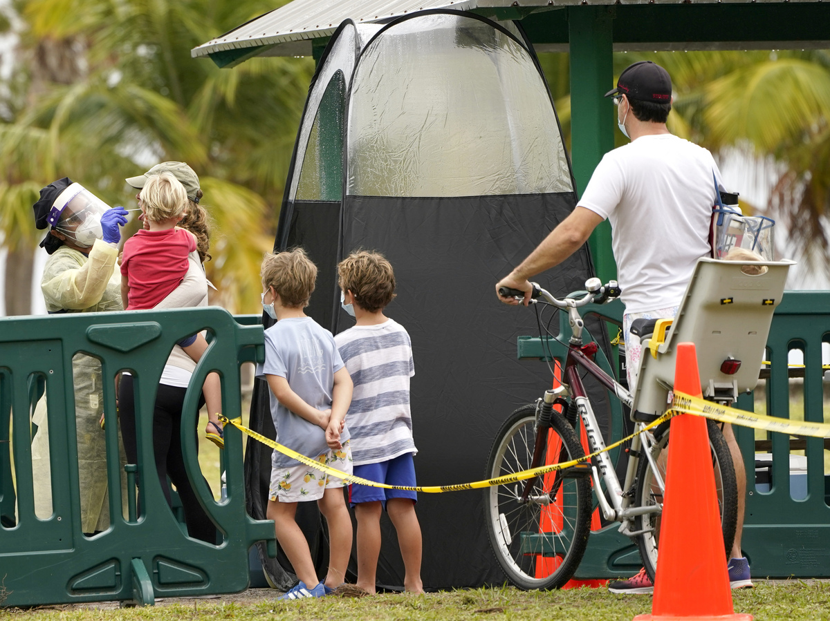 A health care worker (left) administers a coronavirus test at a mobile walk-up testing site at Crandon Park in Miami last month.