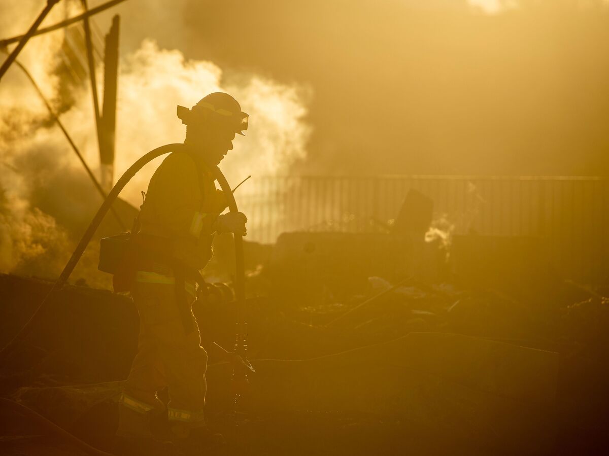 A firefighter sprays down the smoldering remains of a burning home during the Hillside Fire in the North Park neighborhood of San Bernardino, Calif., on Oct. 31, 2019. Some wildland firefighters worry whether they can do their jobs safely during a global pandemic.