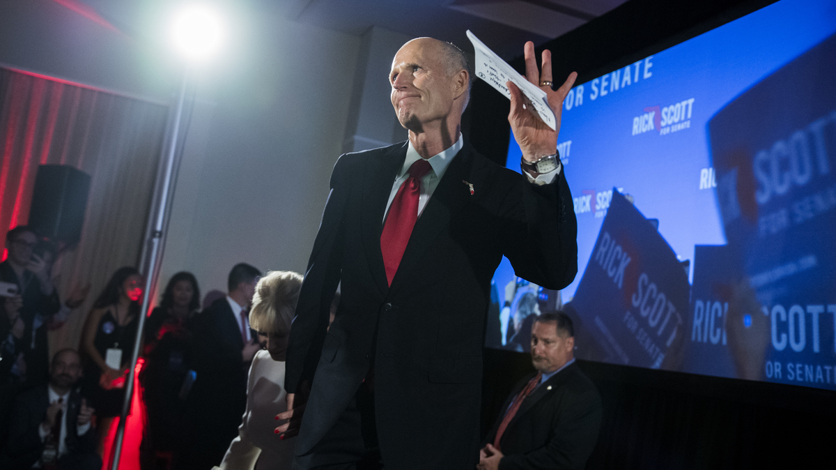 Republican Rick Scott, now a U.S. senator from Florida, takes the stage at his election night party in 2018. Days later, as his margin of victory tightened due to mail votes still being processed, he accused Democrats of trying to "steal" the election without providing evidence.
