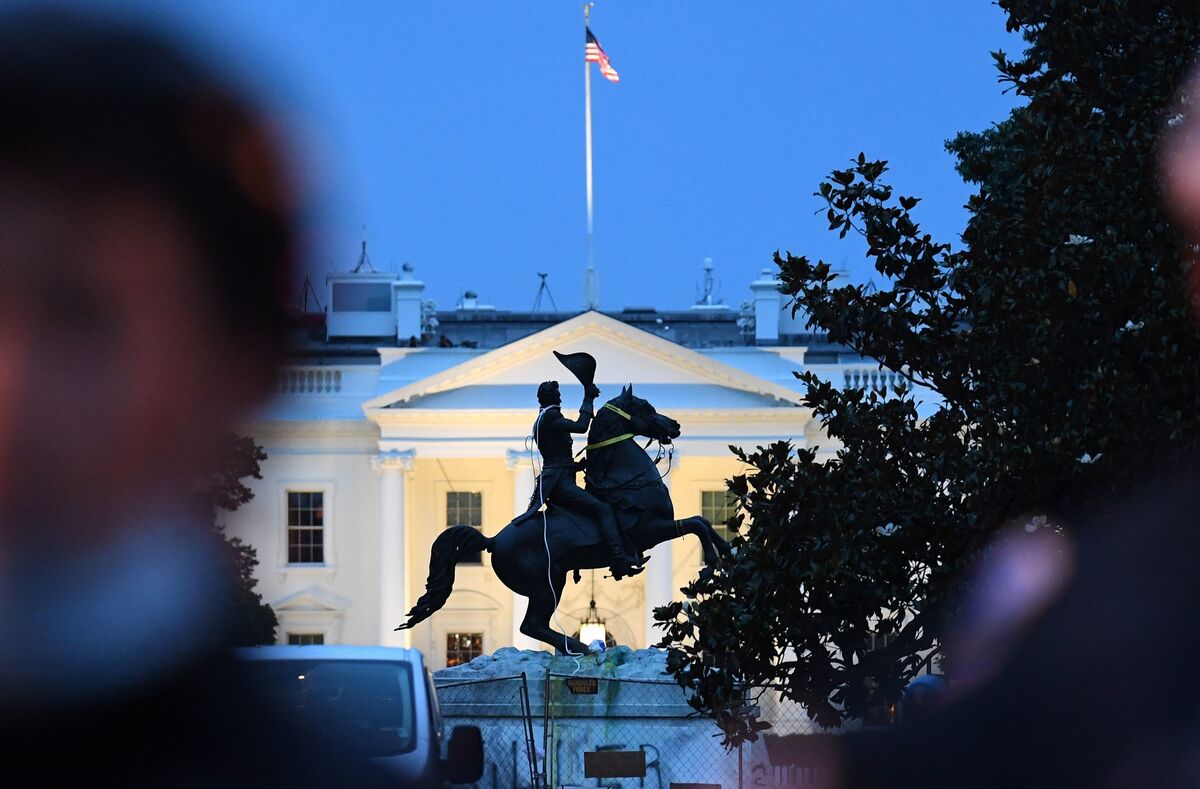Police officers stand guard with the statue of former President Andrew Jackson after protesters tried to topple it Monday in Lafayette Square in Washington, D.C.