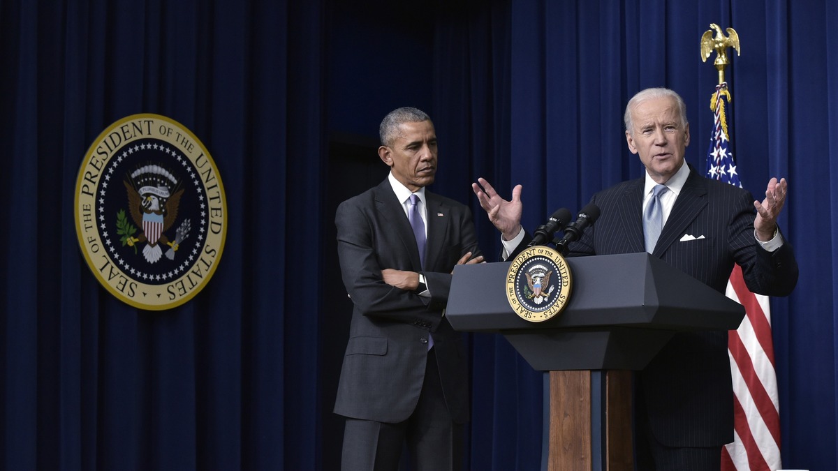 Joe Biden and Barack Obama during a signing ceremony in 2016. The former president took part in a virtual fundraiser Tuesday for his former vice president. Mandel Ngan/AFP via Getty Images hide caption