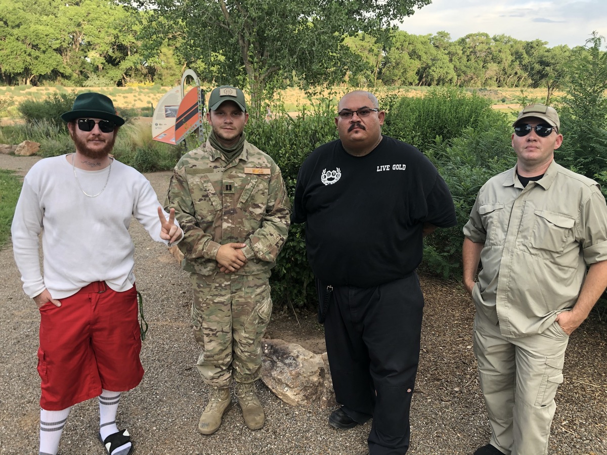 Four members of the Civil Guard recently agreed to an interview around a picnic table in a public park south of Albuquerque, where the sun slanted through the cottonwoods and runners huffed past. They were unarmed and unmasked, except for a young medic named Dakota Farris with a sidearm who said he was there for security.