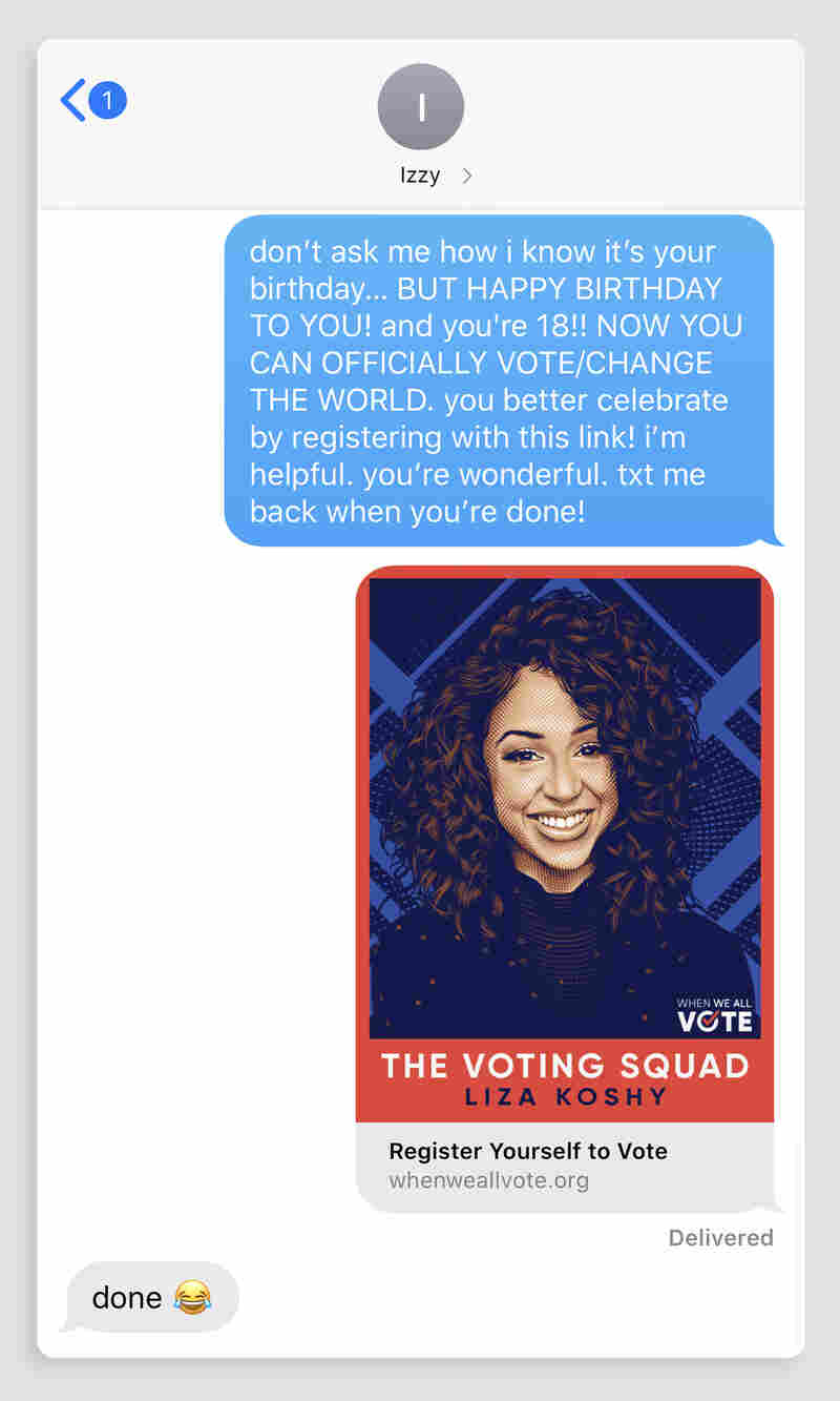As part of its outreach efforts, the nonprofit teamed up with Community, a text messaging platform, in which celebrities like Kerry Washington and the Jonas Brothers send messages to voters on their 18th birthday, reminding them to register to vote.