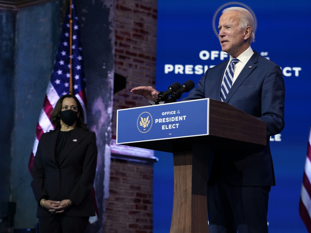 President-elect Joe Biden speaks Tuesday, Nov. 10, 2020, at The Queen theater in Wilmington, Delaware. Carolyn Kaster/AP hide caption