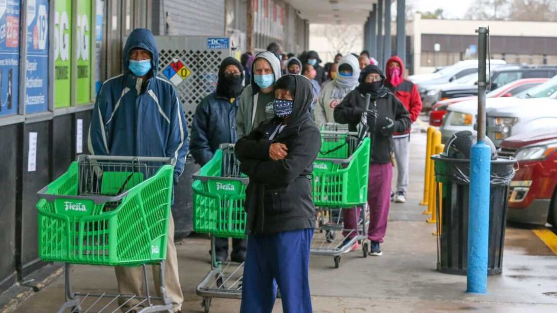 Customers wait in line to enter Frontier Fiesta in Houston, Texas. A winter storm has caused power outages and water disruptions for many people in Texas and the surrounding area. THOMAS SHEA/AFP via Getty Images hide caption