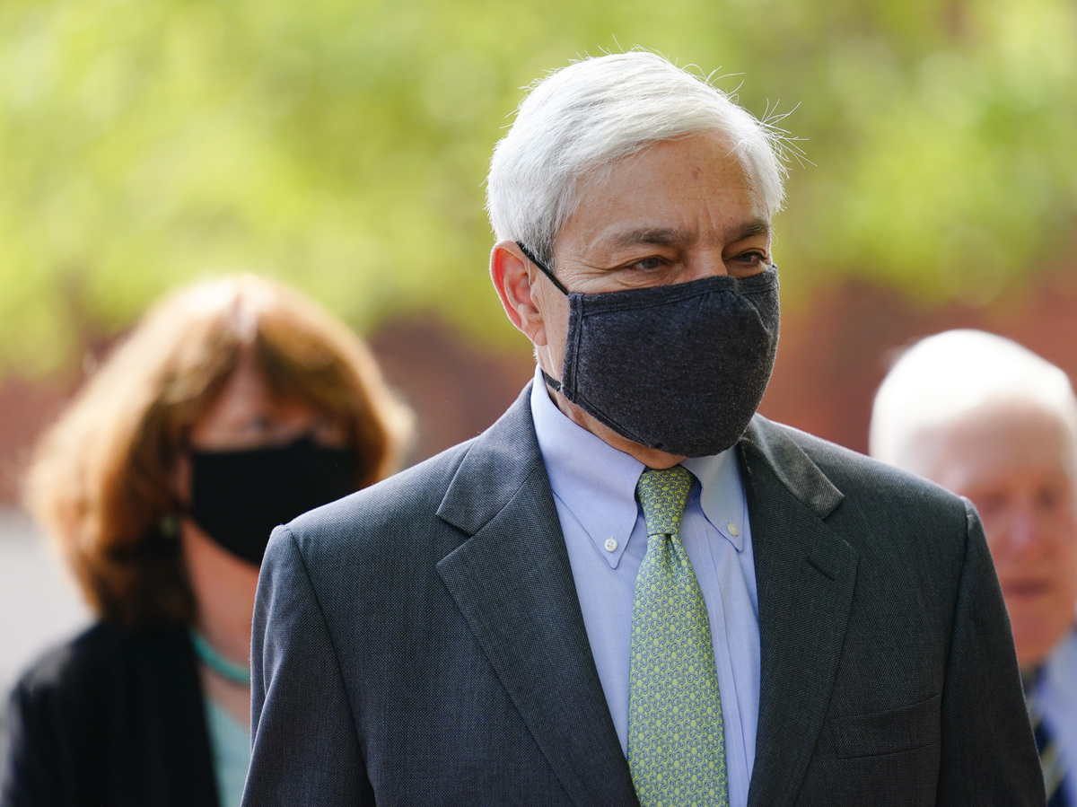 Former Penn State President Graham Spanier walks from the Dauphin County Courthouse in Harrisburg, Pa., after a hearing on Wednesday. A judge said Spanier must report to jail on July 9 to begin serving at least two months for endangering the welfare of children. Matt Rourke/AP hide caption