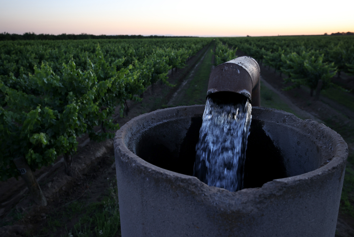 Well water is pumped into an irrigation system at a vineyard in Madera, California. California is suffering from drought, and farmers in the state's Central Valley are pumping more groundwater from their well to make up for a shortfall in water from the state's reservoirs.