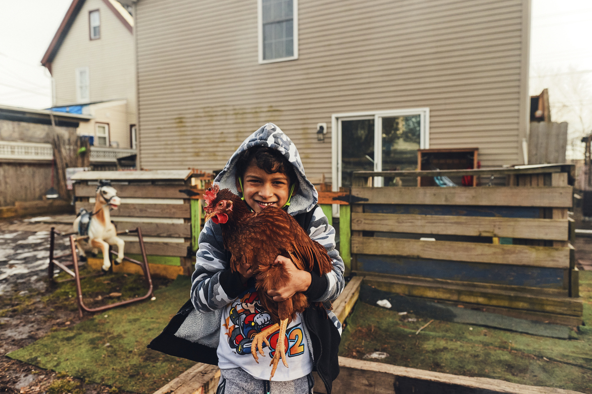 A boy holds a chicken at Ngoh's at-home day care.