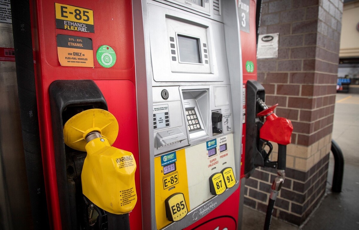 A gas pump at a Kum and Go Convenience Store in Windsor Heights, Iowa shows cheaper prices for ethanol gasoline than standard gasoline.
