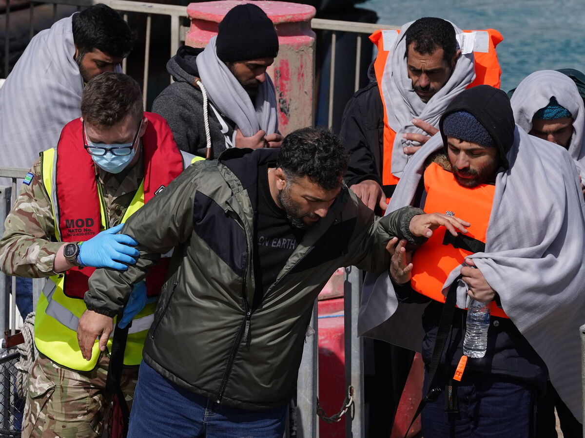 A group of people thought to be migrants are brought in to Dover, Kent, by the RNLI, following a small boat incident in the Channel, Thursday April 14, 2022.