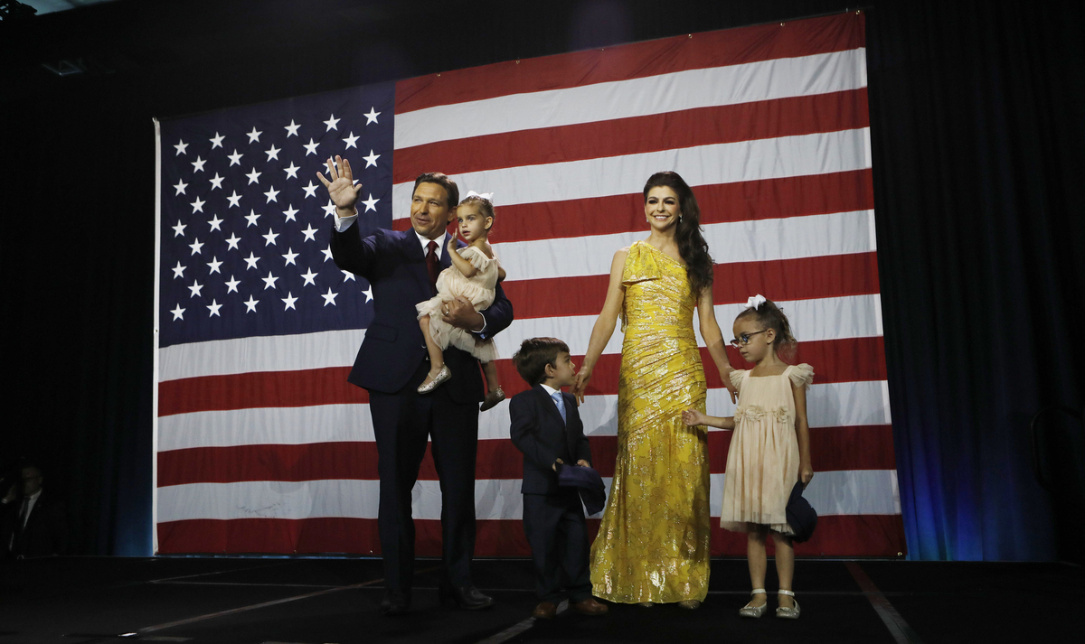 Florida Gov. Ron DeSantis, his wife Casey DeSantis and their children walk on stage to celebrate victory over Democratic gubernatorial candidate Rep. Charlie Crist during an election night watch party at the Tampa Convention Center on Tuesday in Tampa, Florida.