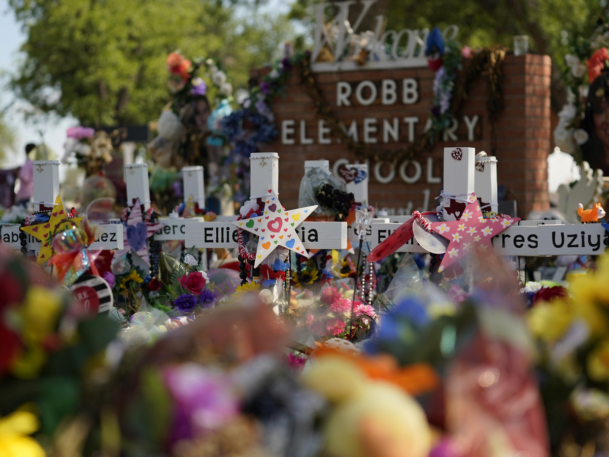 Crosses, flowers and other memorabilia form a make-shift memorial for the victims of the shootings at Robb Elementary School in Uvalde, Texas.