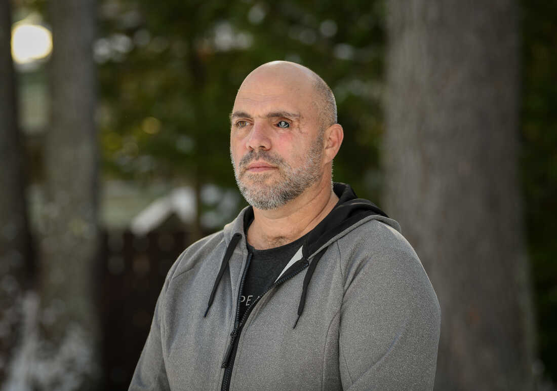 Army Maj. D.J. Skelton works as a volunteer, helping athletes at the Para Bobsleigh World Cup at Mount Van Hoevenberg in Lake Placid, N.Y., Saturday, Nov. 19, 2022. Heather Ainsworth for NPR hide caption