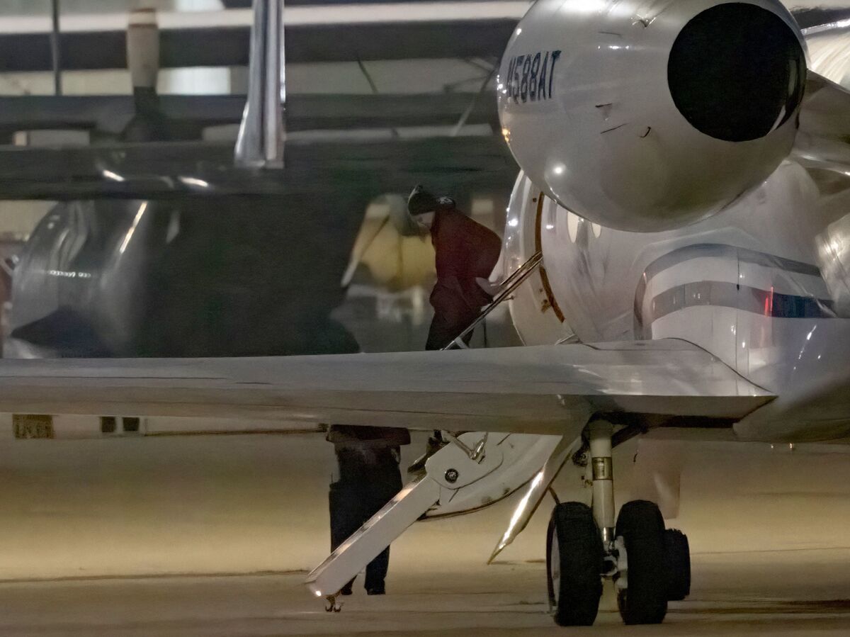 American basketball star Brittney Griner gets out of a plane after landing in San Antonio on Friday.
