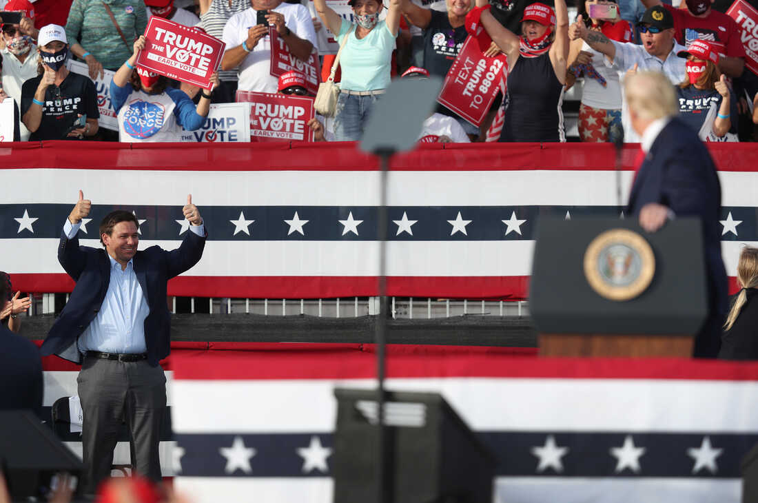Florida Republican Gov. Ron DeSantis gives two thumbs up to former President Donald Trump as Trump speaks during his campaign event on Oct. 23, 2020 in The Villages, Fla. DeSantis is expected to announce he will run for president in 2024 against Trump. Joe Raedle/Getty Images hide caption