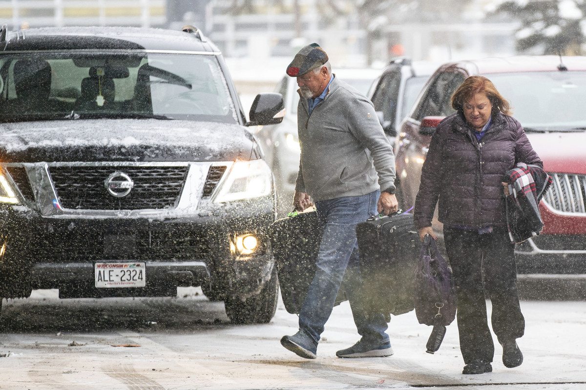 Travelers walk through the snow into Terminal 1 Wednesday, Dec. 21, 2022 at the Minneapolis-Saint Paul International Airport in Minneapolis.