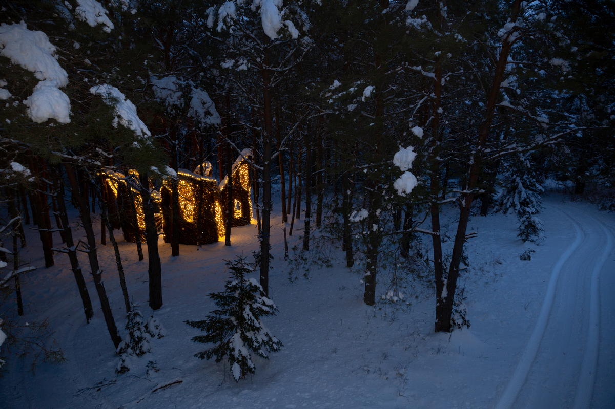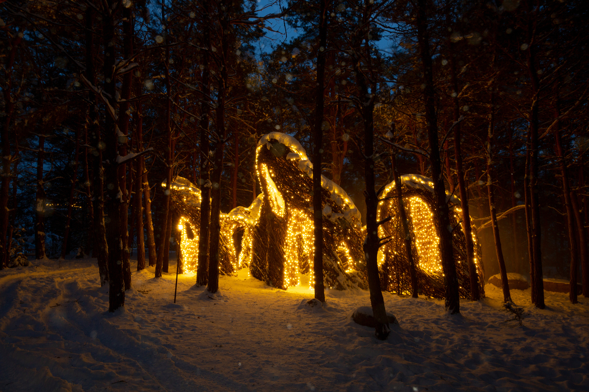 A sculptor has woven branches and twigs into what looks like a big beautiful nest, covered in snow and decked in more white bulbs.