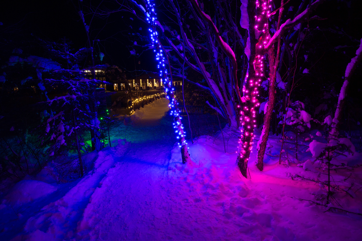 But as we set off across a snow-covered bridge, the path is luminous, decked in glittering white bulbs.