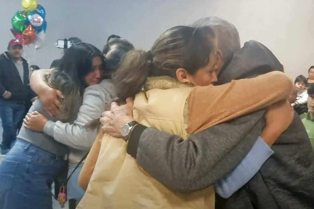 The Rodriguez Tellez family poses for a picture, together for the first time in 25 years. The sign says, "25 years waiting for a hug. We love you."