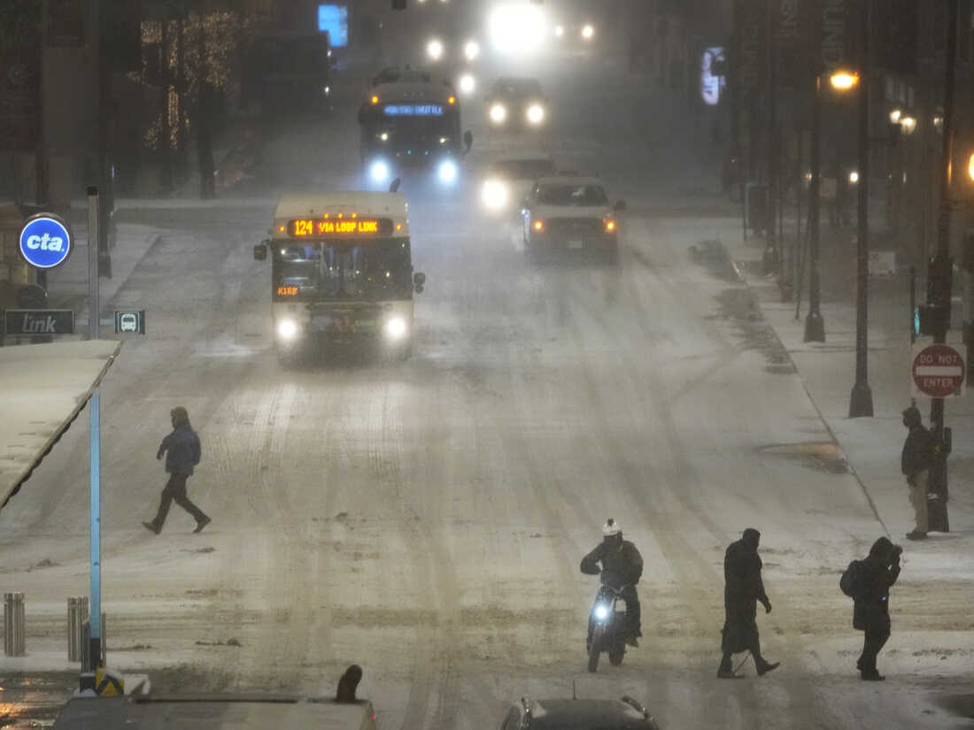 Pedestrians navigate slippery streets Thursday in Chicago's famed Loop. A massive winter storm will be hovering over the majority of the country for a few days featuring strong sub-zero wind chills and major snow accumulation.