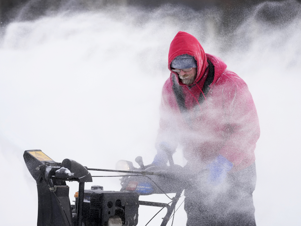 Mark Sorter clears snow on Friday from a downtown ice skating rink in Des Moines, Iowa.