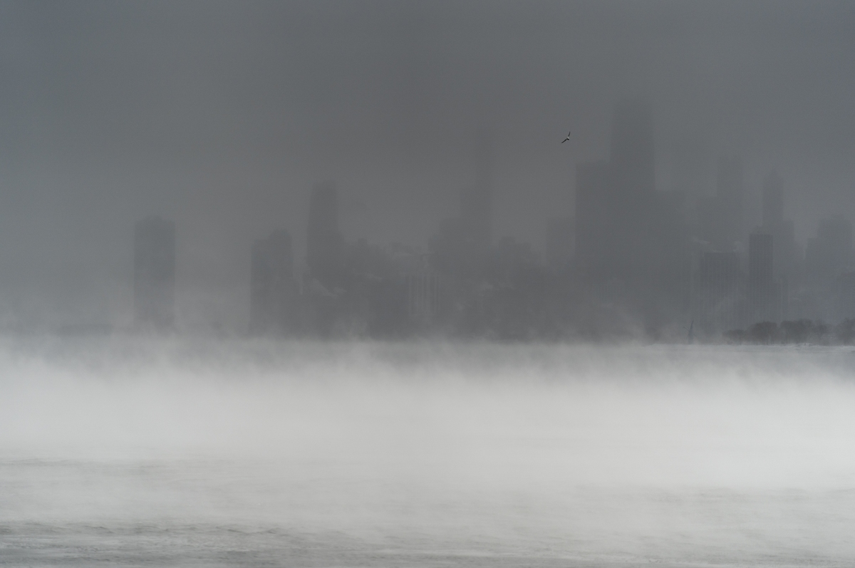 The downtown Chicago skyline is obscured by blowing snow and steam rising from Lake Michigan, as seen from Montrose Harbor on Friday, in Chicago.