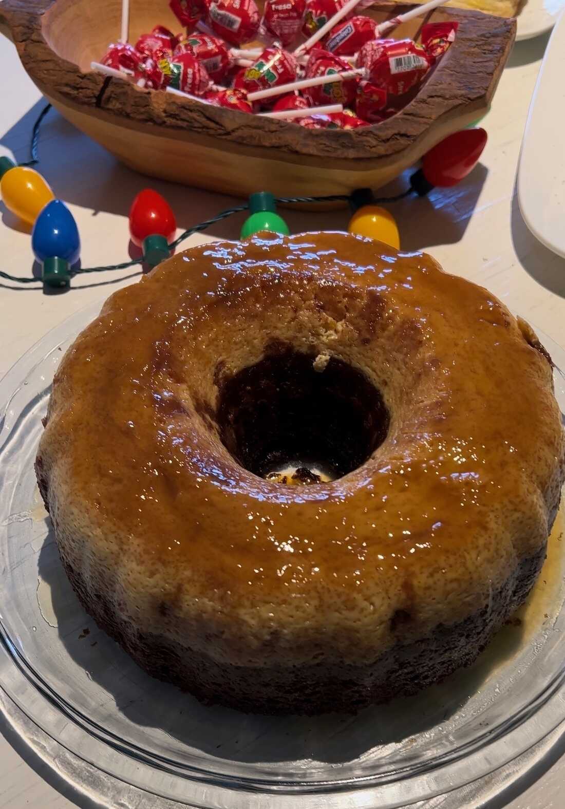 Chocoflan, a Colombian dessert, and Colombian candies like Bon Bon Bum lollipops are served at a novena this year. Maria Acosta hide caption