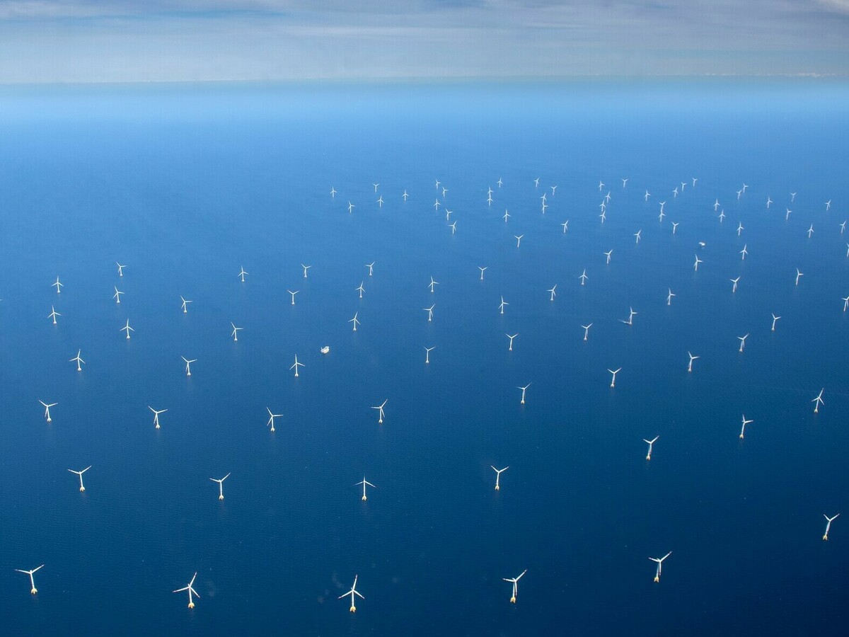 This aerial photograph taken on June 16, 2022, shows a wind turbine farm in the Baltic Sea, northeast of Rugen Island in Germany.