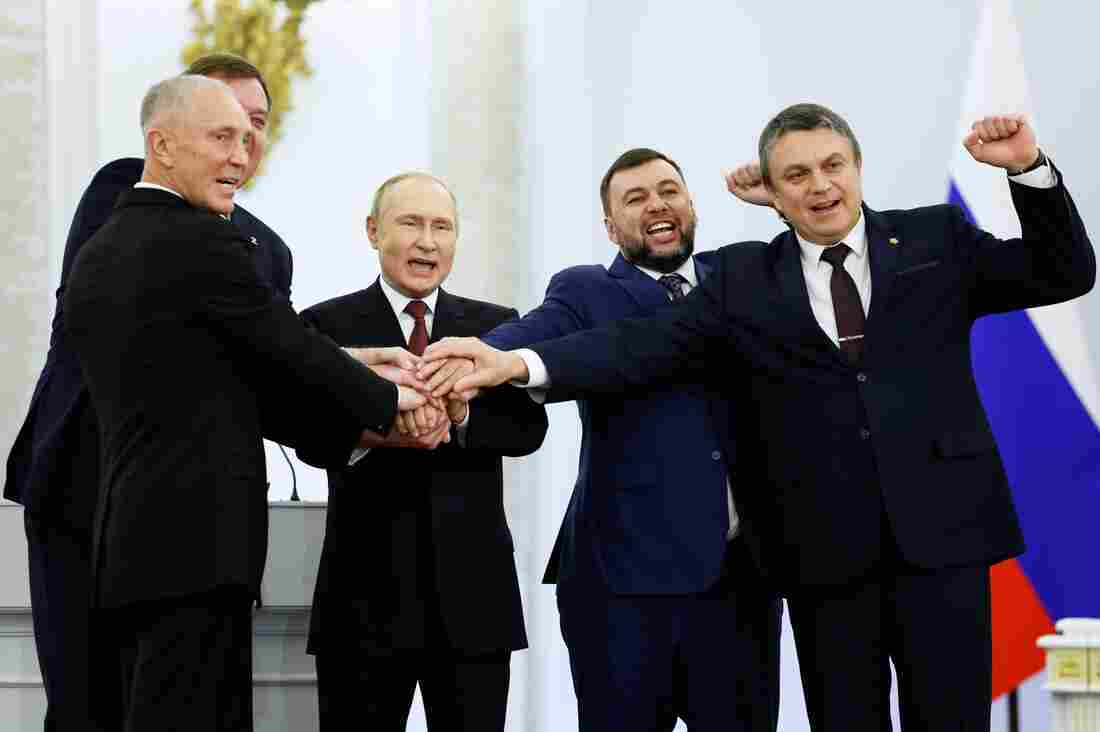 Leaders of four regions of Ukraine with Russian President Vladimir Putin in Moscow on Sept. 30, after signing a treaty to join Russia. From left: Moscow-appointed head of Kherson Region Vladimir Saldo, Moscow-appointed head of Zaporizhzhia region Yevgeny Balitsky, Putin, Denis Pushilin of self-proclaimed Donetsk People's Republic and Leonid Pasechnik of self-proclaimed Luhansk People's Republic. Dmitry Astakhov/Sputnik/Government Pool Photo/AP) hide caption