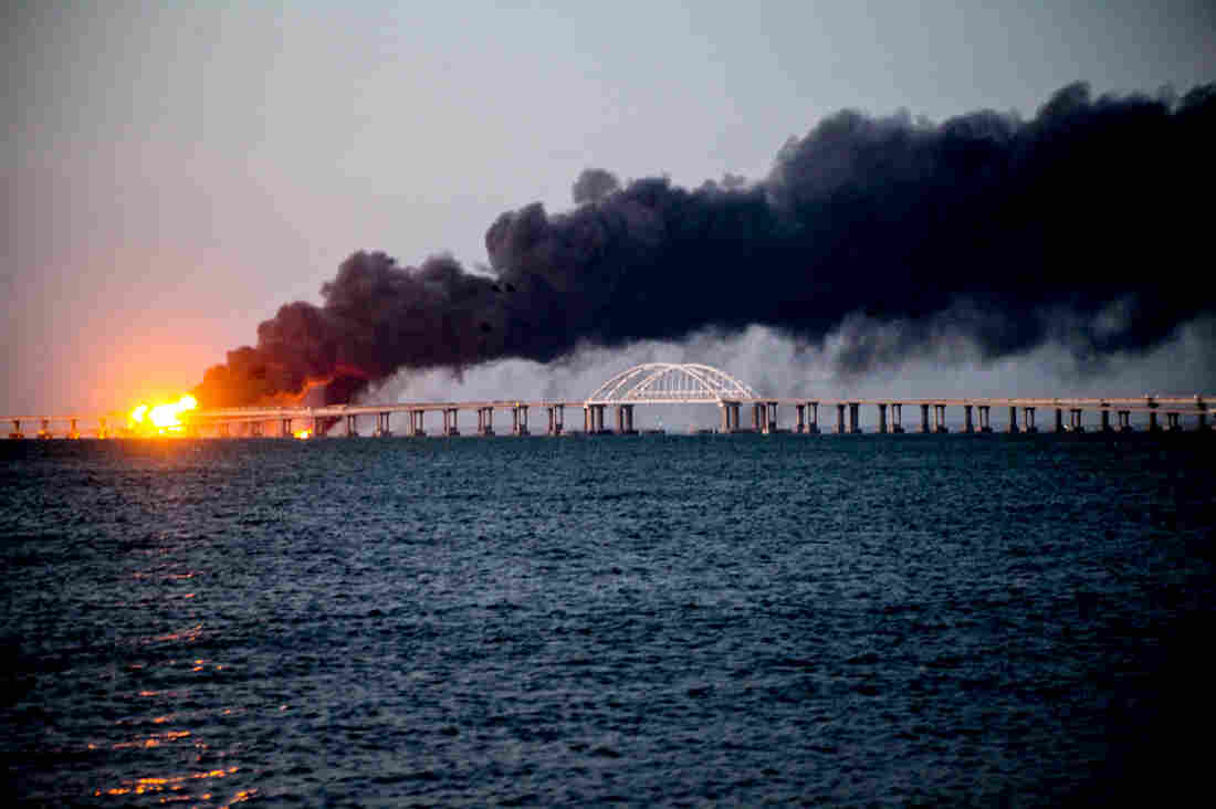 Fire on the Kerch bridge in the Kerch Strait, Crimea, following an explosion on Oct. 8. Vera Katkova/Anadolu Agency/Getty Images hide caption