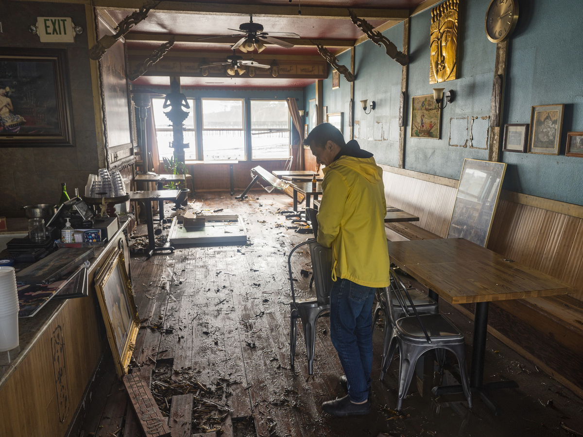 Dominic King, owner of My Thai Beach, surveys storm damage in his restaurant in Capitola, California.