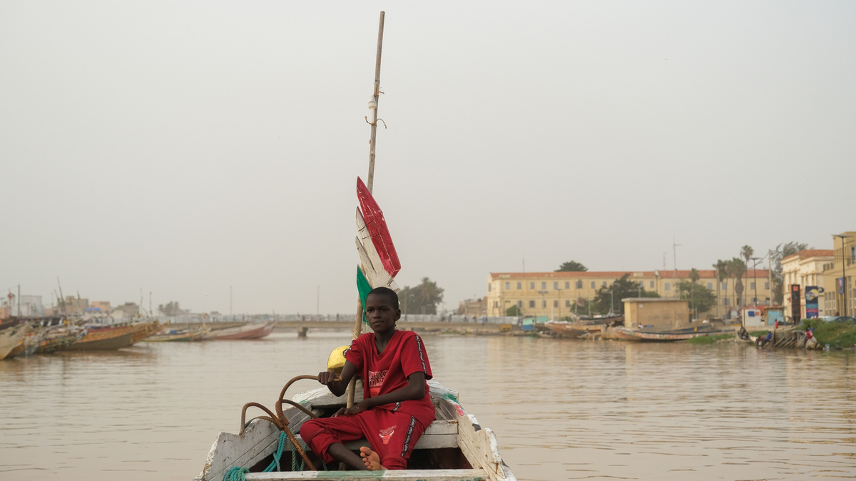 Guet N'dar, Senegal (October 5, 2022) - a young man on the boat of Moustapha Dieye, with Saint-Louis in the background.