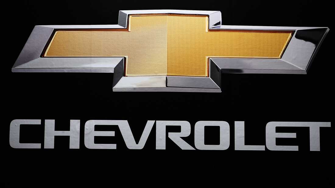 A Chevrolet logo is pictured during the Tokyo Auto Salon in Tokyo on Jan. 12, 2020. Chevrolet on Tuesday unveiled a hybrid version of its Corvette sports car.