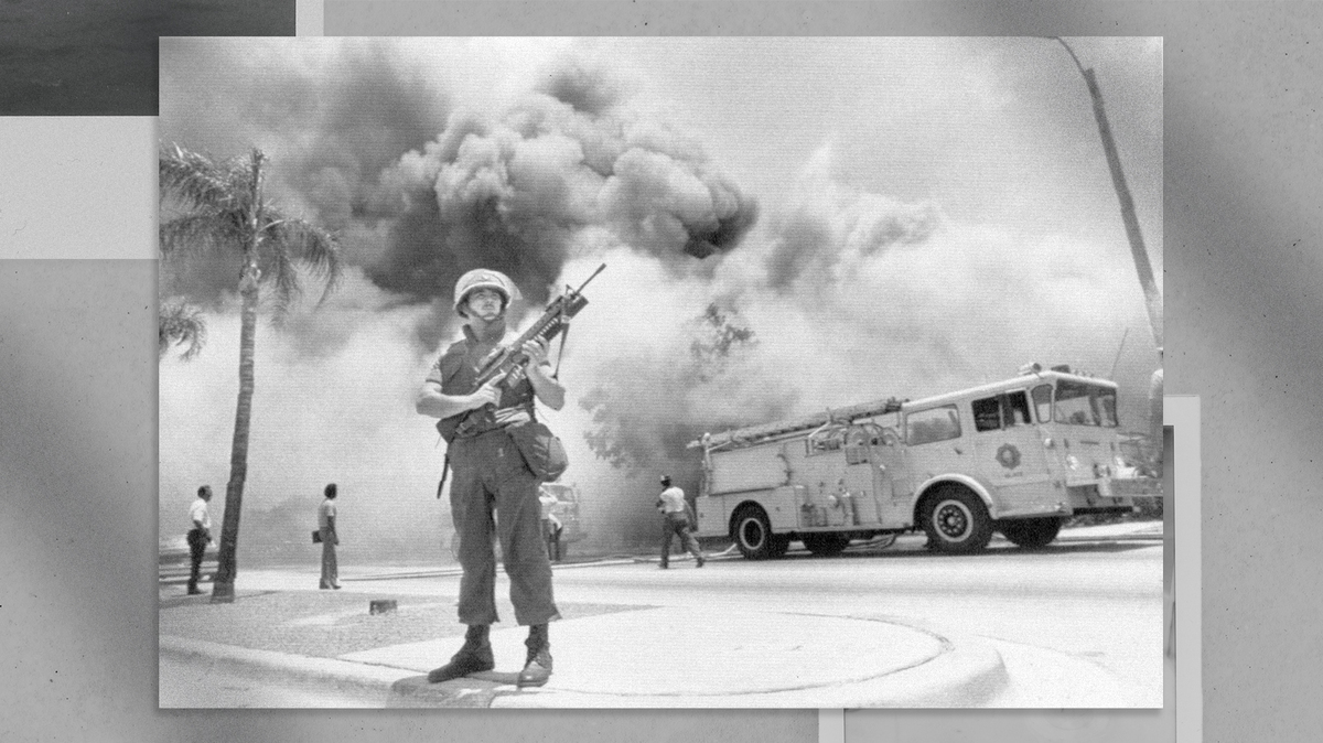 A Florida National Guardsman stands guard in the Liberty City neighborhood of Miami as firefighters battle a blaze in the area after rioting on May, 20, 1980.