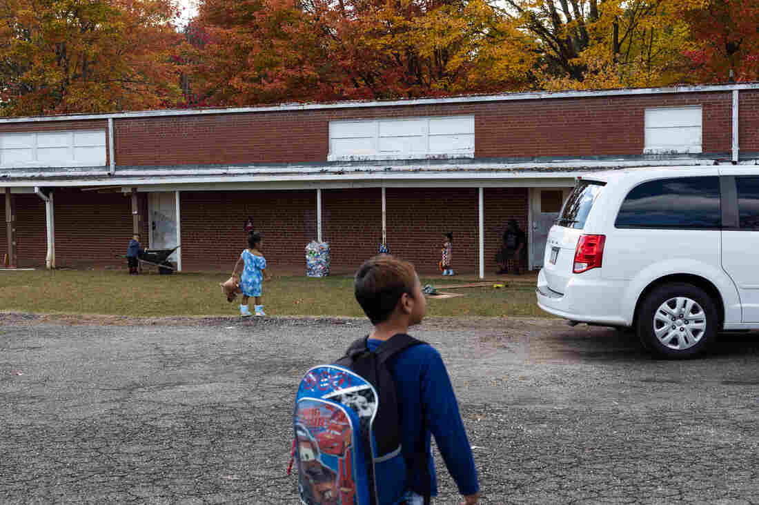Children arrive from a school at the Marshallese New Beginnings Church in Connelly Springs, N.C. Juan Diego Reyes for NPR hide caption