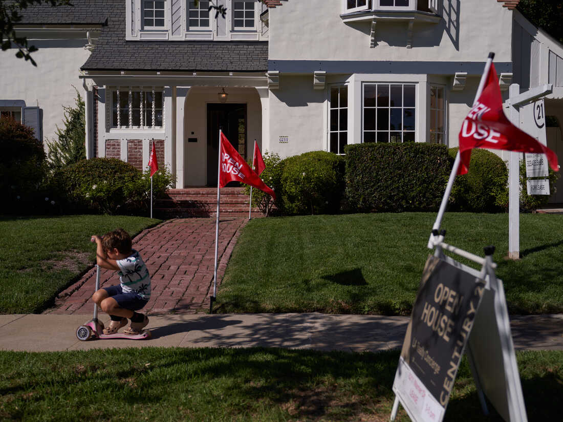 A child rides a scooter past an open house in Los Angeles. Allison Dinner/Getty Images hide caption