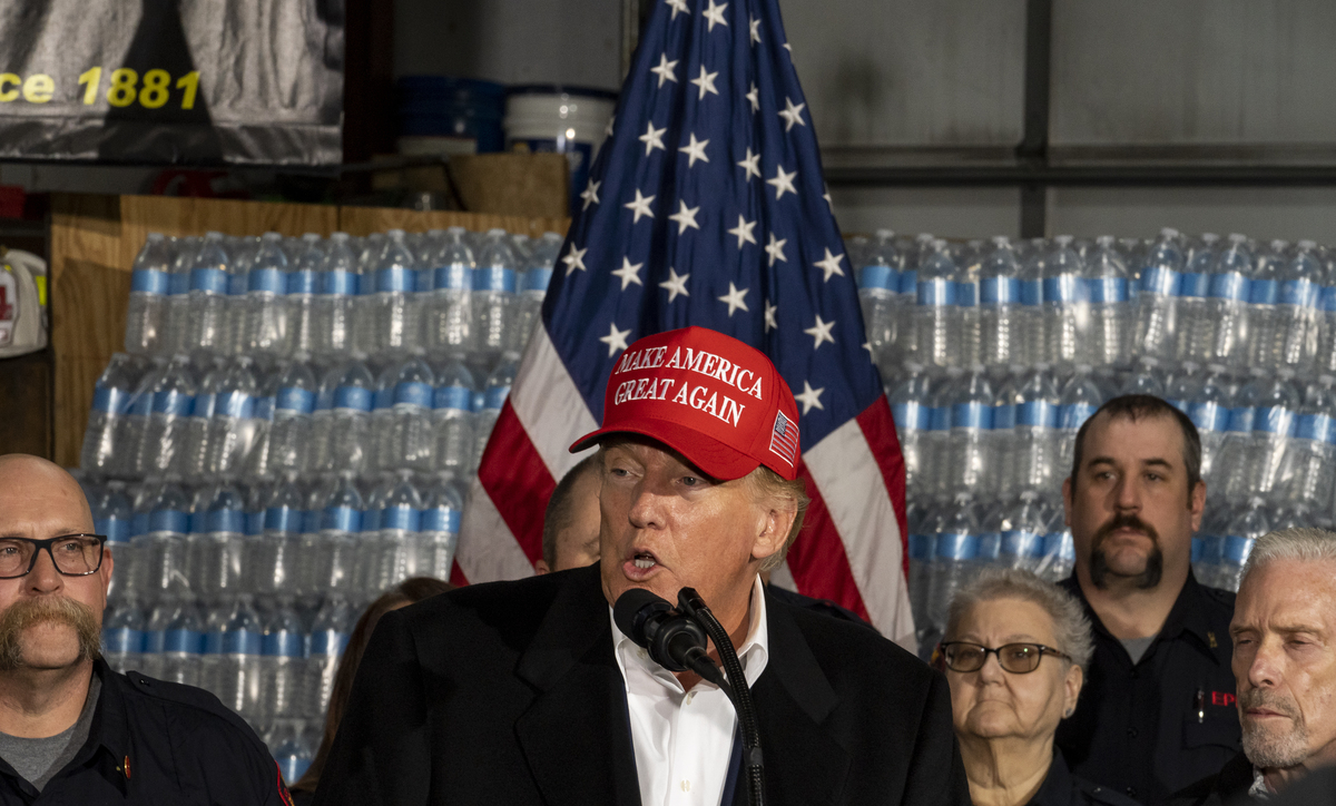 During a visit to East Palestine, Ohio, former President Donald Trump stands in front of a pallet of "Trump"-branded water before delivering remarks at the East Palestine Fire Department station Wednesday. Michael Swensen/Getty Images hide caption
