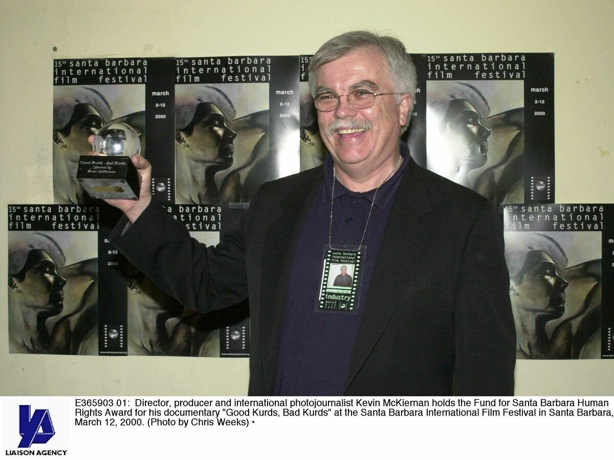 Journalist and filmmaker Kevin McKiernan, pictured winning the Santa Barbara Human Rights Award for his documentary "Good Kurds, Bad Kurds" in 2000.