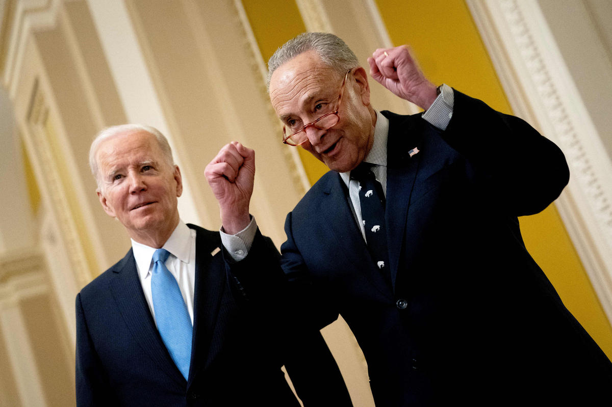 President Joe Biden and Senate Majority Leader Chuck Schumer speak to reporters as they depart the Senate Democrat policy luncheon at the Capitol on March 2.