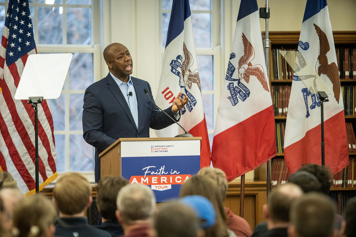 Republican Sen. Tim Scott of South Carolina speaks during a Faith in America tour event at Drake University in Des Moines, Iowa, on Feb. 22.