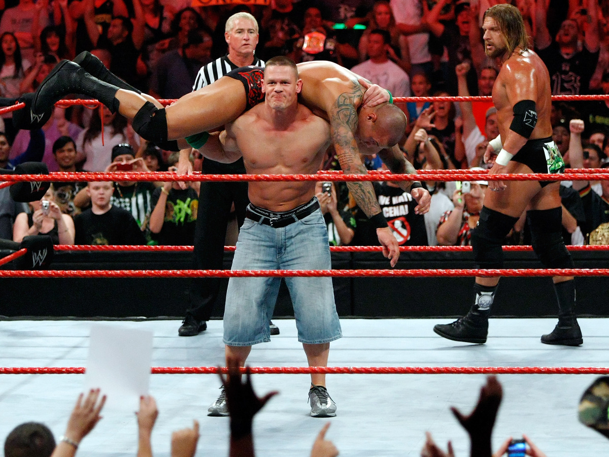 LAS VEGAS - Wrestler John Cena picks up wrestler Randy Orton as wrestler Triple H (R) looks on during the WWE Monday Night Raw show at the Thomas & Mack Center August 24, 2009 in Las Vegas, Nevada.