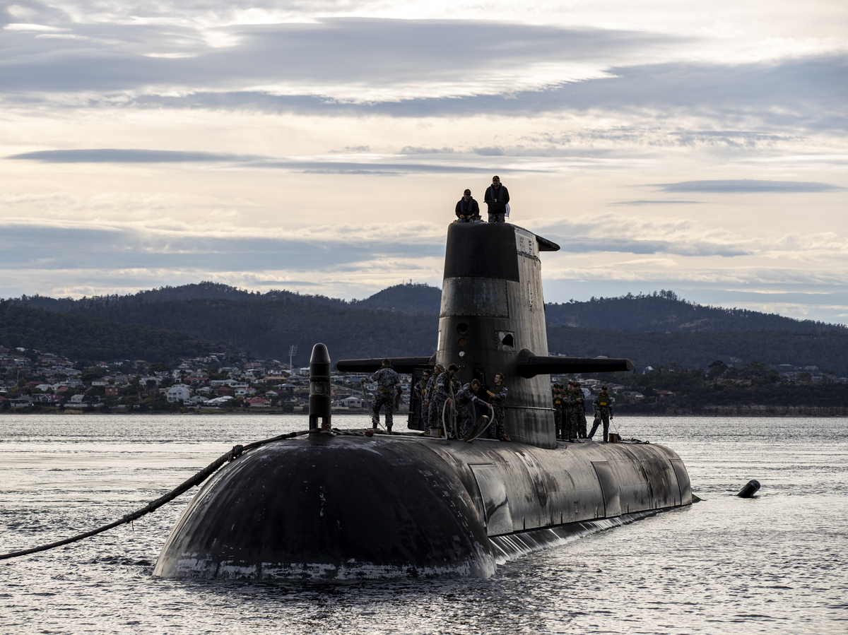 A Royal Australian Navy submarine arrives at a logistics port visit on April 1, 2021 in Hobart, Australia. New nuclear-powered submarines will eventually replace them.