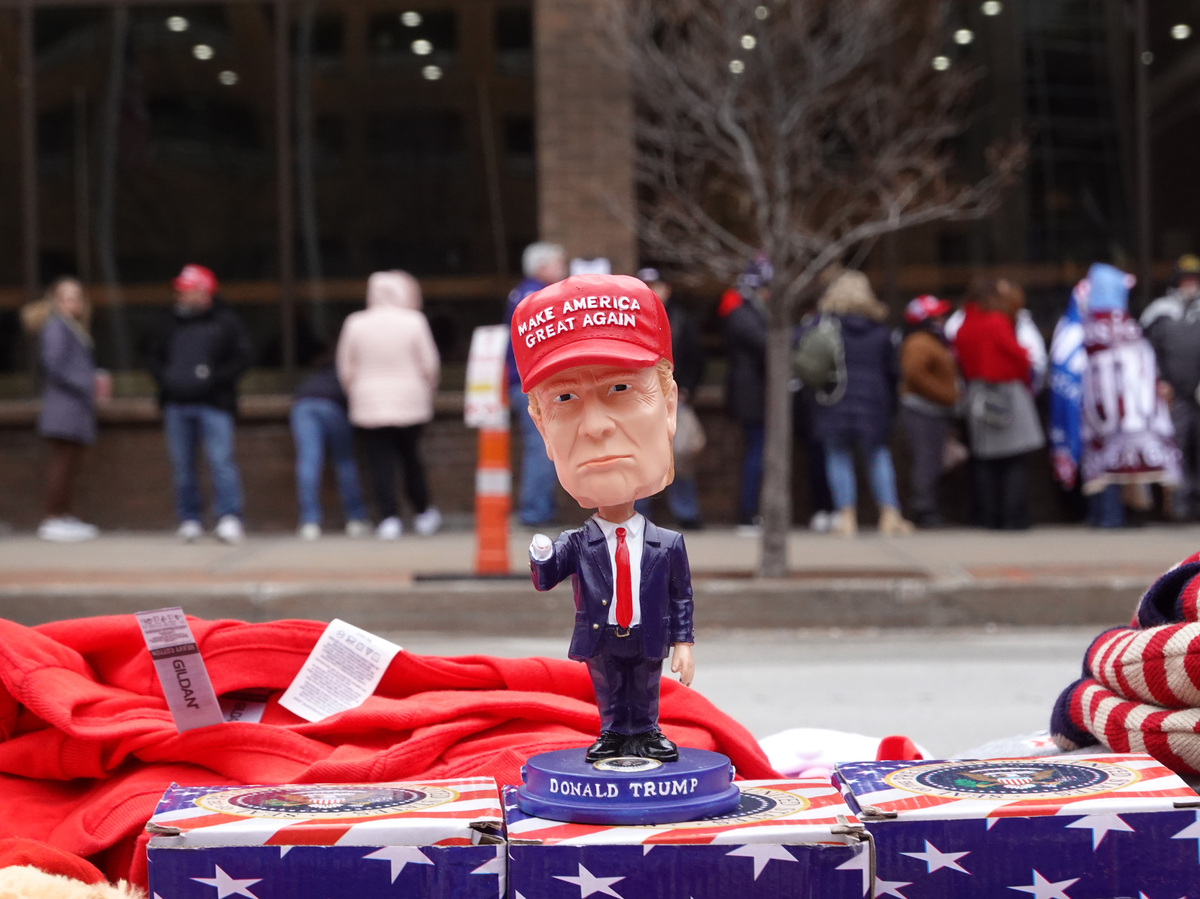Merchandise is displayed for sale as guests wait in line to hear former President Donald Trump deliver a campaign speech in Iowa earlier this month. Scott Olson/Getty Images hide caption