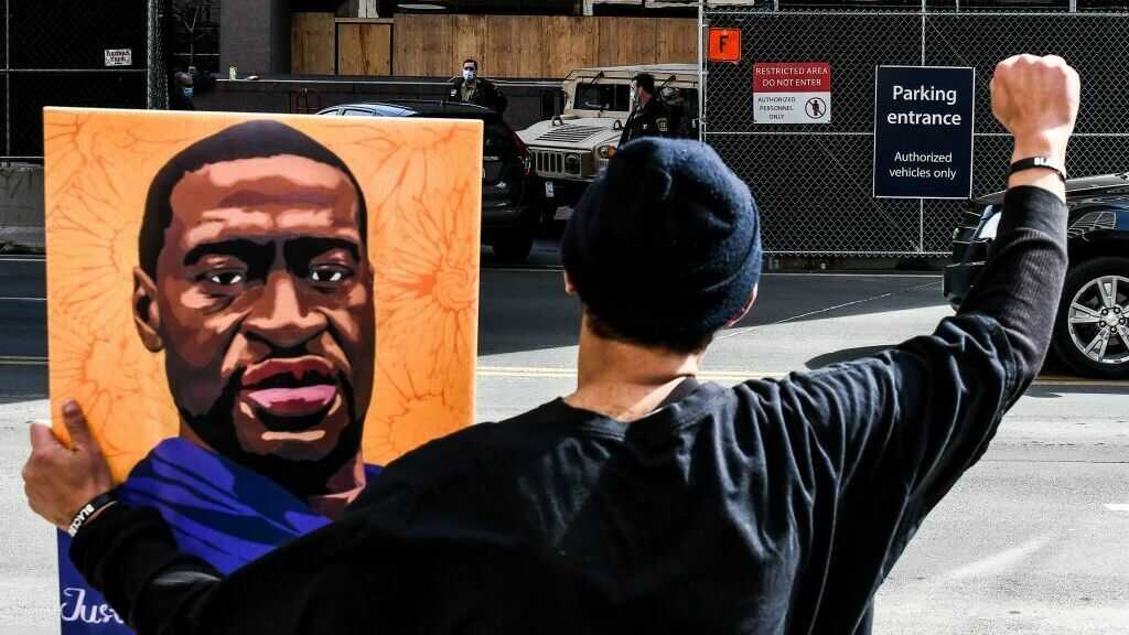 An demonstrator holds a portrait of George Floyd in March 2021 outside the Hennepin County Government in Minneapolis, where the trial of former Minneapolis Police Department officer Derek Chauvin in Floyd's killing was under way.