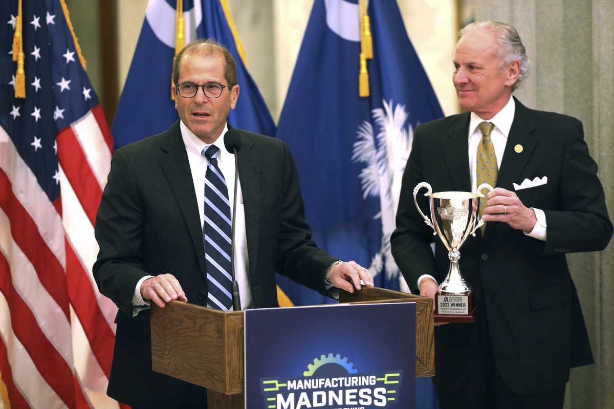 Nucor Vice President Mike Lee speaks as South Carolina Gov. Henry McMaster holds a trophy after Nucor's steel was named the coolest thing made in South Carolina. Jeffrey Collins/AP hide caption