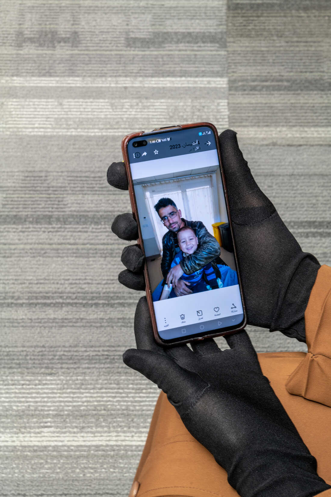 Narmeen al-Zamel displays a photo of her husband, Thaer al-Rahal, and their son on her phone. Moises Saman for NPR hide caption